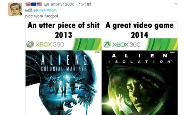 批评了Gearbox开发的《异形:殖民军》,和CA开发的《异形:隔离》相比就是一坨屎