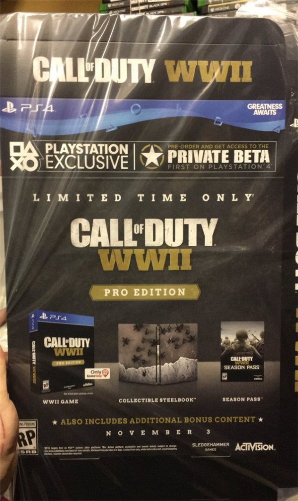 今日据国外玩家在NeoGAF上爆料了一个某个商店的特供版本,确认《使命召唤14》将推出一个高级版(Pro Edition),11月3日发售。该版本将包含一个游戏季票,铁盒和《使命召唤14》游戏本体(PS4)。此外该版本还确认,《使命召唤14》的内测将首先在PS4平台展开。