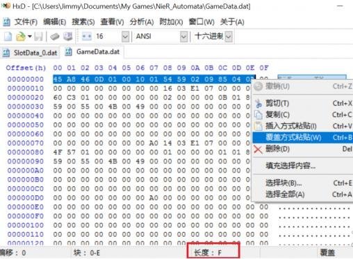 7. 打开现在的GameData.dat,也就是原本别人分享出来的那个源文件,如图,选中第一行同样长度,注意,是同样长度F的数值,贴上你刚刚暂时记录下的特征码(右键 -> “以覆盖方式粘帖”),保存;