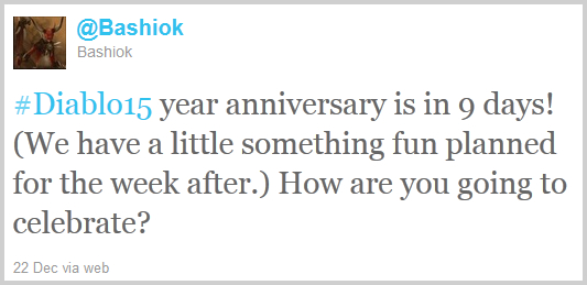 感谢teamug为我们带来了这条差点被遗漏的信息。Bashiok的个人推特主页在22号的时候发出了一条有意思的消息,暗示我们在即将到来的暗黑系列15周年那段时间,也许会有些惊喜。之前在11月底的时候,话题就曾集中在暗黑系列15周年的纪念活动上,但当时最终没有放出任何东西。