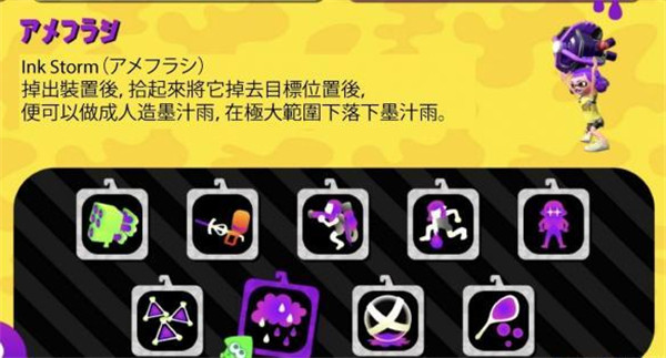 未推出的SP武器,可以发出最多三个大墨汁气泡,飘至一定距离后才爆破。