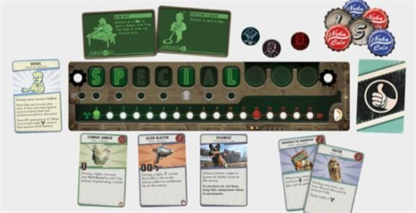面板下方的卡牌是食尸鬼角色的装备——狗肉(Dogmeat)队友也是装备的一部分,S.P.E.C.I.A.L. 面板处 " 点亮 " 的字母标志着角色的优势,专长(Perk)卡牌是可一次性使用的消费品,保留时可点亮 S.P.E.C.I.A.L. 面板的对应字母,使用后可获得与牌面对应的奖励,例如图中寻宝者(Fortune Finder)专长卡牌的描述是 " 弃牌可获得 8 枚瓶盖 "。