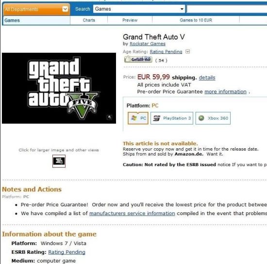 日前,《侠盗猎车手5(GTA5)》已经可以在亚马逊上进行预购,在网页上我们看到了《GTA 5》PC版的消息,游戏仅支持Window 7和Vista。