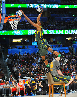 今天的奥兰多,犹他爵士的杰瑞米·埃文斯采用了高难度动作完成了今年的全明星扣篮大赛表演。队友戈登·海伍德向空中抛出了两个球,埃文斯高高跃起,空中接力将两球先后扣进篮筐。正是这一扣,帮他奠定了扣篮王的宝座。赛前,记者向埃文斯采访,他说他是从Youtube上得到了扣篮花样的灵感,并且希望在赛后NBA 2K12能调高他的扣篮值。看过今天的表演后,不容置疑,埃文斯理应在2K12里获得一个更像样点的扣篮值。