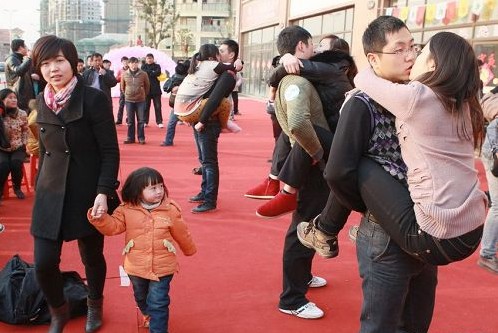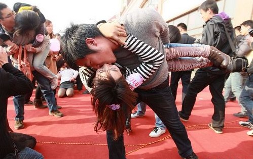在中国安徽合肥,一对对情侣集聚一堂,开展接吻比赛,为的就是有机会赢得1克拉钻戒与幸福的感觉。