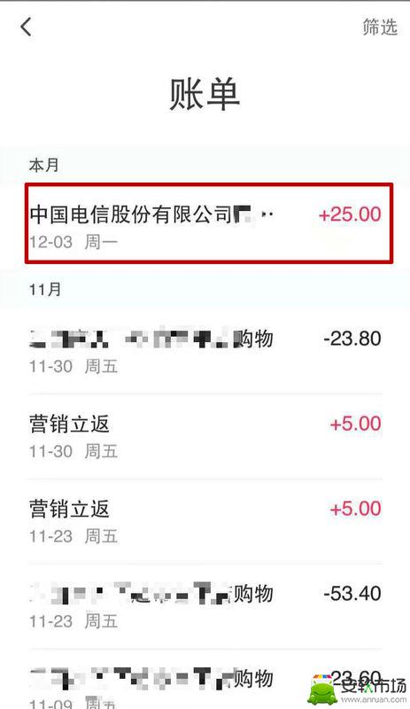 3、之后我们可以在账单里面选择返还的话费选项;