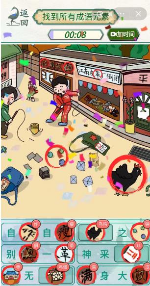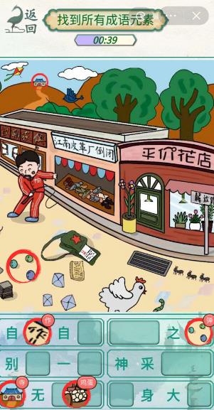 1、首先是先进入游戏关卡中,然后是需要在下方图中找到所有的成语元素。