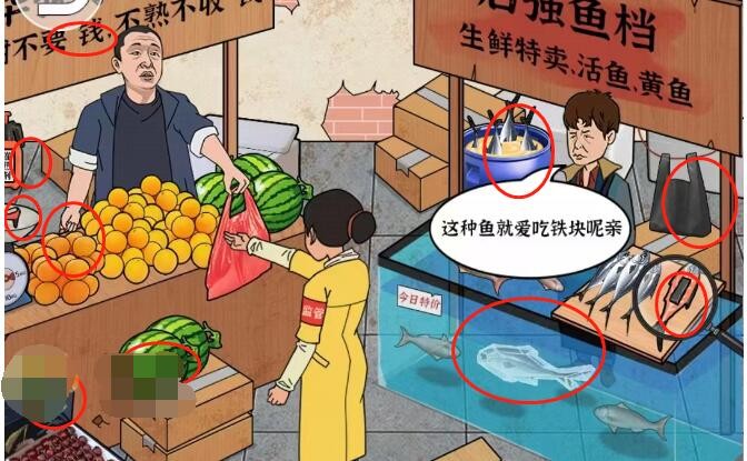 2、点击鱼档后面的工业桶出现工业黄鱼,点击水果摊后的催熟剂