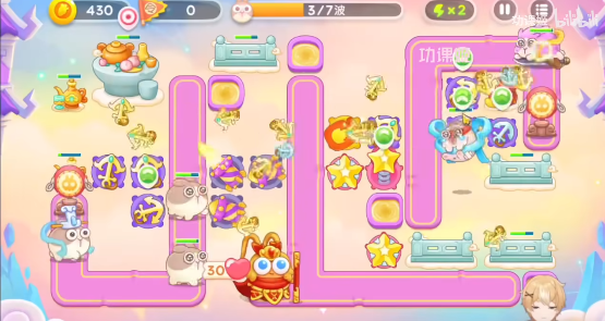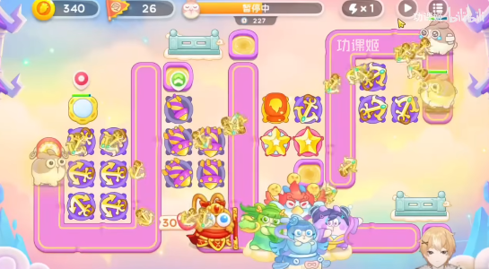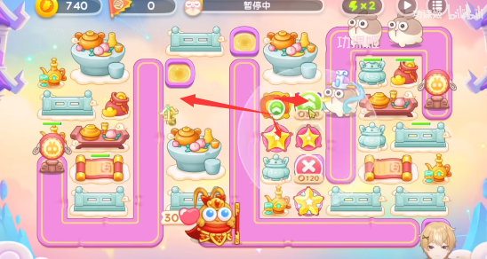 3、之后继续往左侧清理,中间区域都放星星塔+烟花炮,有钱都升级,右上角的起点和左下角起点的旁边都可以放船锚炮,第三波道具全清有点难,留一点之后清理也可以;