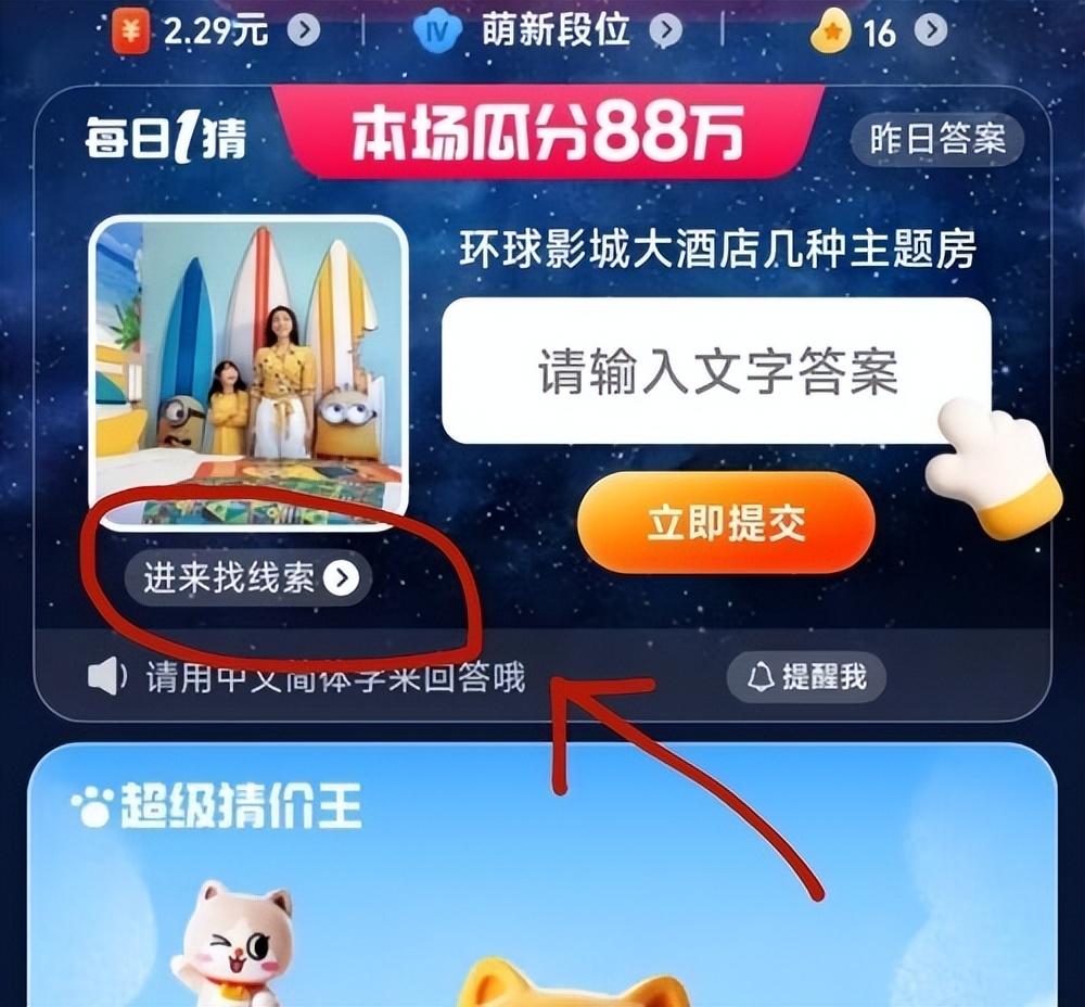1、在每日一猜的活动页面了,接着我们可以看见下方的【进来找线索】的功能。