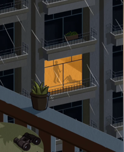 1、在阳台上,我们点击望远镜查看对面楼里的情况。
