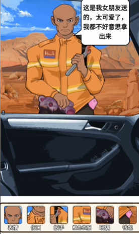 手里面拿的玩偶和扳手、橙色的衣服、脖子上的伤口。