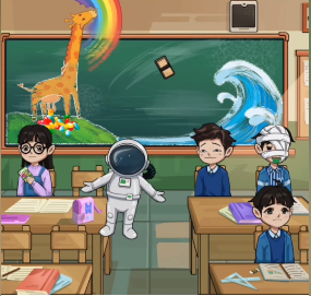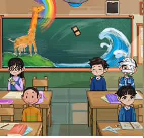 1、我们先点击黑板报上的长颈鹿,就会掉落下彩虹糖