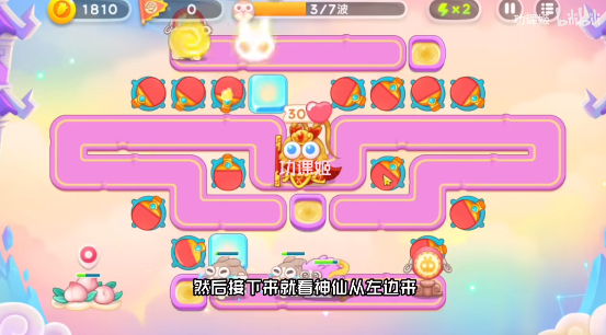 4、注意还有冰冻兔,被冻动的炮塔要及时打掉,粉兔的数量也有点多,注意不要漏掉,第二个是其余的神仙,可以锁头打,可以下起点都放毒针,下面位置补几个太阳,之后还有拿葫芦的神仙,还是顺着路线放炮塔就行。