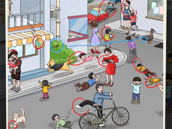 2、骑车爸爸的退、玩手机的妈妈、小猫、书包、小狗、喇叭、趴在地上的孩子、婴儿车、吃糖的粑粑。