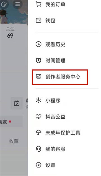 我们打开抖音APP,然后点击右下角我的选项,再点击右上角的三条横线图标,点击里面的创作者服务中心。