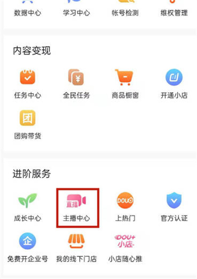 接着在全部分类中,需要找到主播中心的功能,在最下面的进阶服务这里即可找到。
