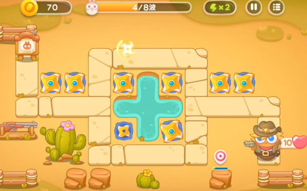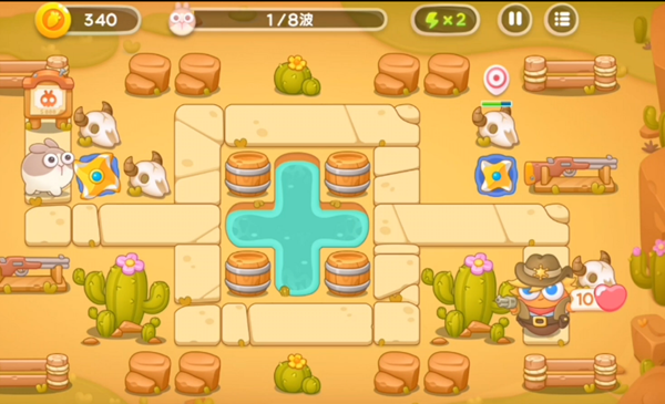 开局先是在左右两边各摆放上一个风扇塔,在攻击兔子的同时攻击两边的牛头。