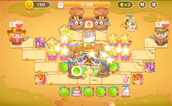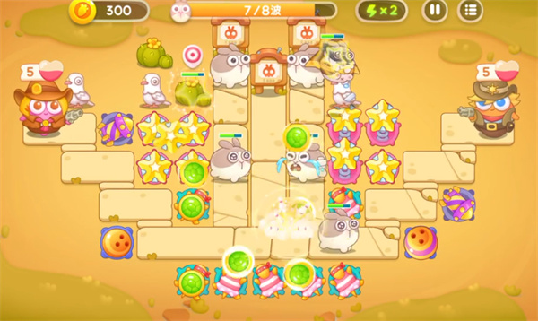 1、首先玩家在下方道路的中间位置放置两个乌龟炮台清理小怪,在靠近中间的位置放置星星炮台清理障碍物。