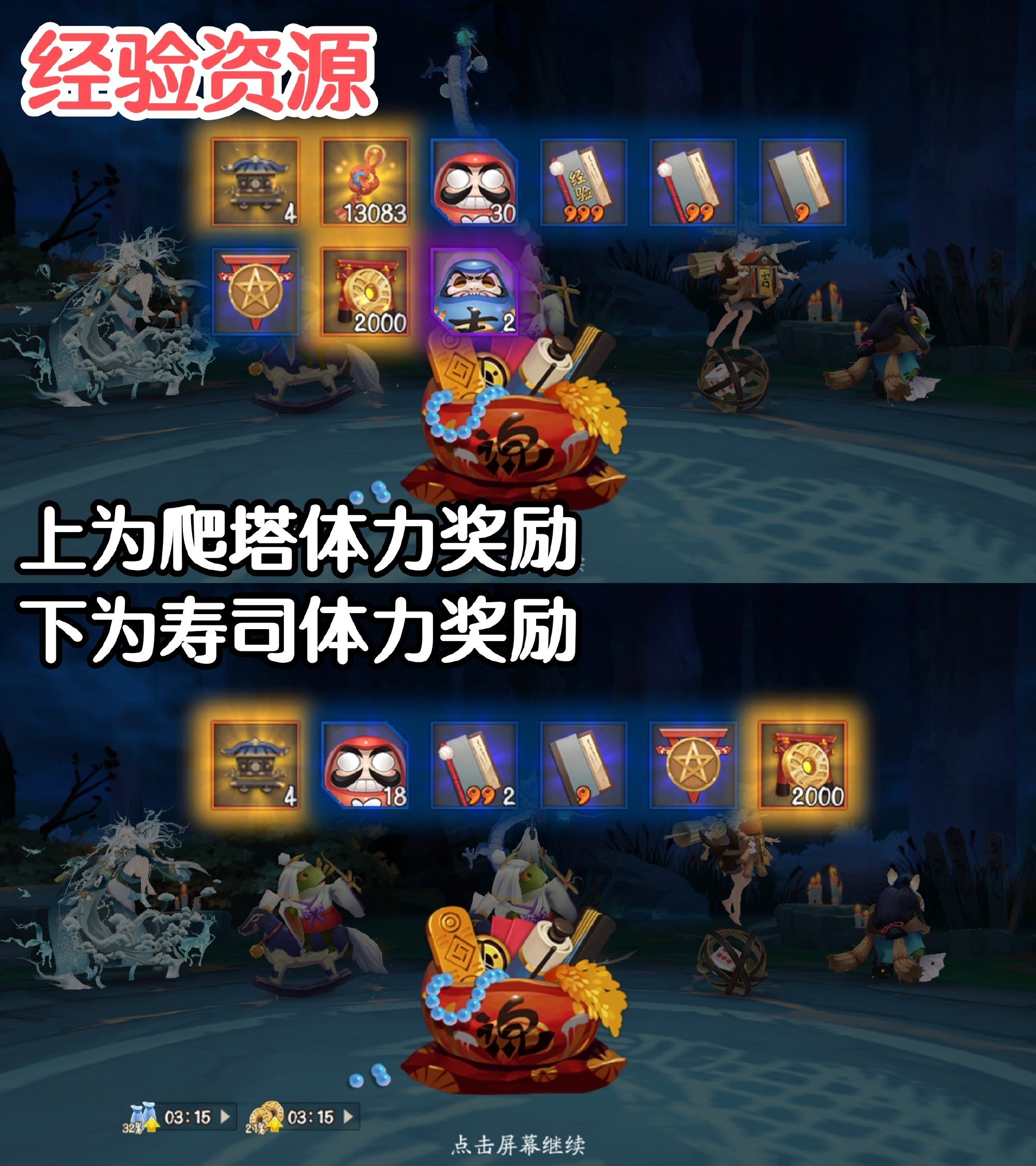 5.不论哪种资源,爬塔积分都一致;爬塔体力/寿司体力都是每局4花车经验,整个活动上限800点经验