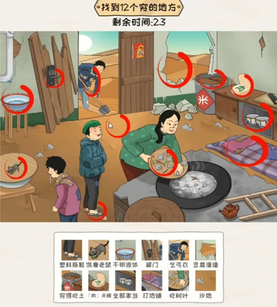 需要玩家找出所有能够证明大婶贫困的地方,一共有12处,具体如下: