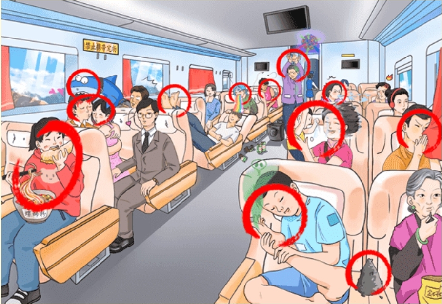 2、后面第三排的男人脱鞋伸脚,第4排的人还在呕吐。