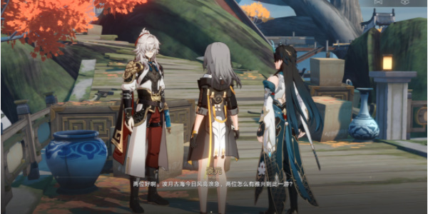 1、到长乐天凉亭找到丹恒,看到丹恒在和一个持明族女人对话,她是白露的侍女浣溪。
