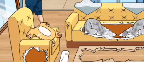 13、 拖动剪刀到双人沙发,点击沙发里的狗子。