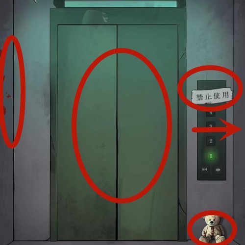 点击禁止使用的纸条、玩具熊以及左边墙上的红字和右边墙上的通知,电梯开门后出现的鞋子。