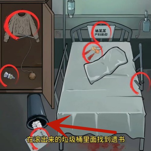 6、在如图箭头指示的位置来回滑动三次会出现垃圾桶,点击纸团收集遗书的线索。