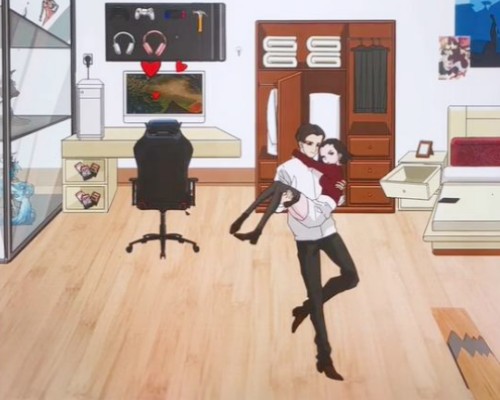 4、打开中间的衣柜,拖动男人头上的剪刀到衣柜里的抱枕上,接着拖动出现的衣服给女友穿。