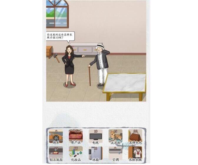 答案:跑车、电视、空调、衣柜衣服、流浪狗、化妆品、房产证、床、冰箱、名牌包包,钻戒。