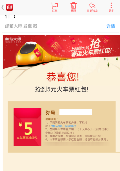 4.火车票红包以后,系统会给你所添加的邮箱地址发送邮件,告诉你火车票红包的兑换码,大家赶紧登陆邮箱大师查看兑换码吧。