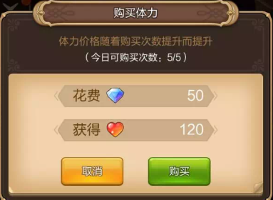 当玩家将原有的体力资源都消耗完毕之后,可拥有5次体力购买的机会,花费钻石500钻石购买600点体力,换取600点经验值!