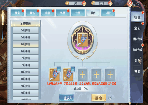 1、5阶及以上同阶橙色1星、橙色2星、红色2星护符或手镯分别合成同阶红色2星、红色三星护符或手镯。