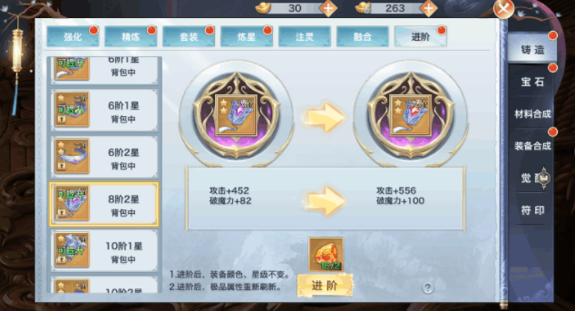 2、进阶后,装备的颜色,星级不变,装备进阶提升1阶。