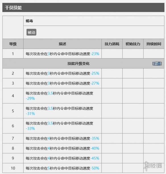 1技能为平a附带减速,与减速辅助不同,狮蝎减速就是减移速,就算出了狮蝎攻击范围,也会减速到持续时间结束。减速辅助干员攻击间隔为1.9s,效果为停顿0.5s,相当于常态减速26% 当然真理安杰需要减速的时候开技能效果就远远超过了 ,而狮蝎7级技能为35%,如果一进入狮蝎攻击范围就减速的话,在攻击范围内能为高台多提供53%的输出时间。以sk5为例,可以使得狮蝎攻击范围与输出重叠。也可以直接放在重装面前,延缓重装接敌的时间,让高台先白嫖一会近战敌人。一般我在高台位充足不需要狮蝎补输出的情况下携带1技能,来为高台创造更好的输出环境。减速只有在10级后达到5秒,8-10为每级增加百分之5减速,个人觉得性价比不高。