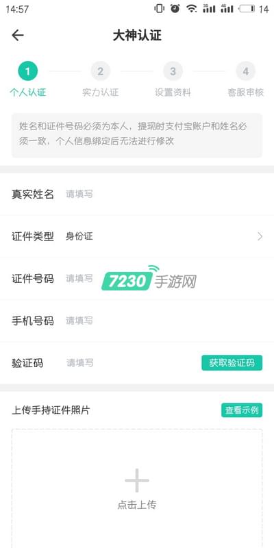 4.进入大神认证,首先填写个人资料,然后就是实力认证,设置资料,客服审核,只要客服审核通过了就可以陪玩了,详细如下图所示。