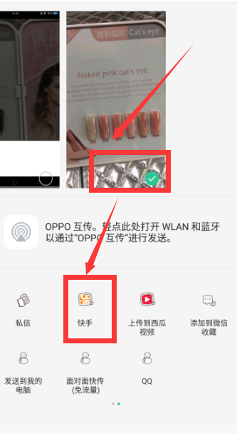 2.在相册里面选中刚刚保存的图片,点击“发送”,然后选择发送到“快手”,如图所示