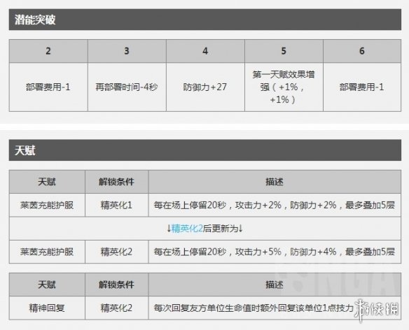 天赋1充能护服非常强大,充能后能提供可观的攻防,攻击力提升的同时也提升了塞雷娅的奶量。精2后充能完毕的塞雷娅面板数据非常可观,在精1充能满的情况下,塞雷娅的防御已经追上传统坦克,攻击力则大幅领先传统坦克。精2充能后攻防数据都超越传统坦克,精2充能后相比精1多了13.6%的攻击力/奶量和9%的防御力,提升相当可观。