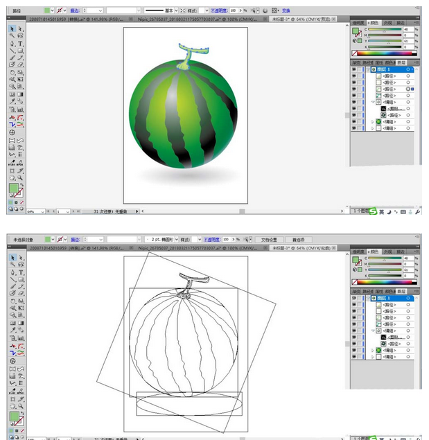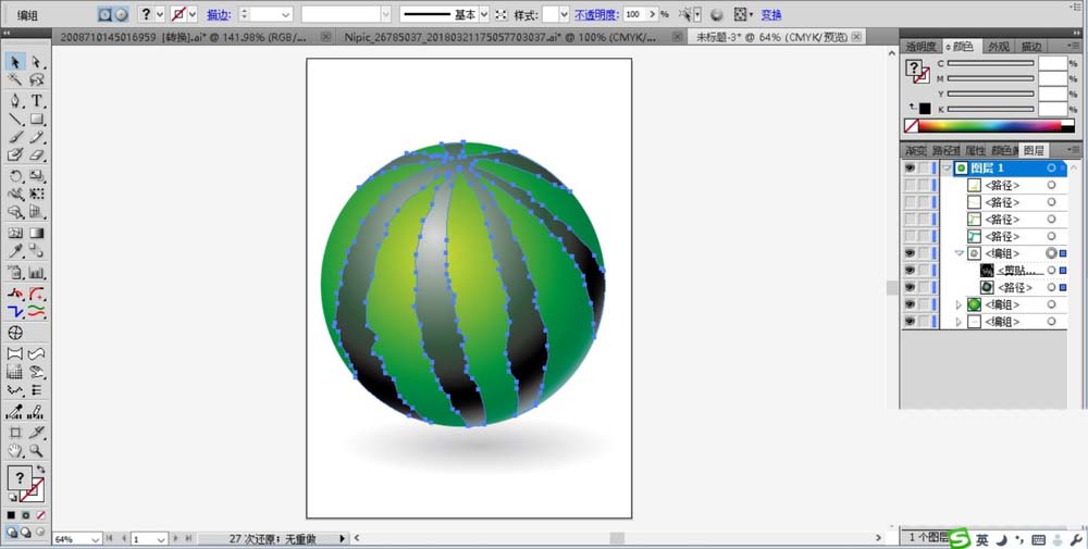 用钢笔工具画出西瓜表面的波浪形状的花纹路径,用这个路径剪切这个矩形的灰黑色的渐变。从而让花纹呈现在西瓜的正面。