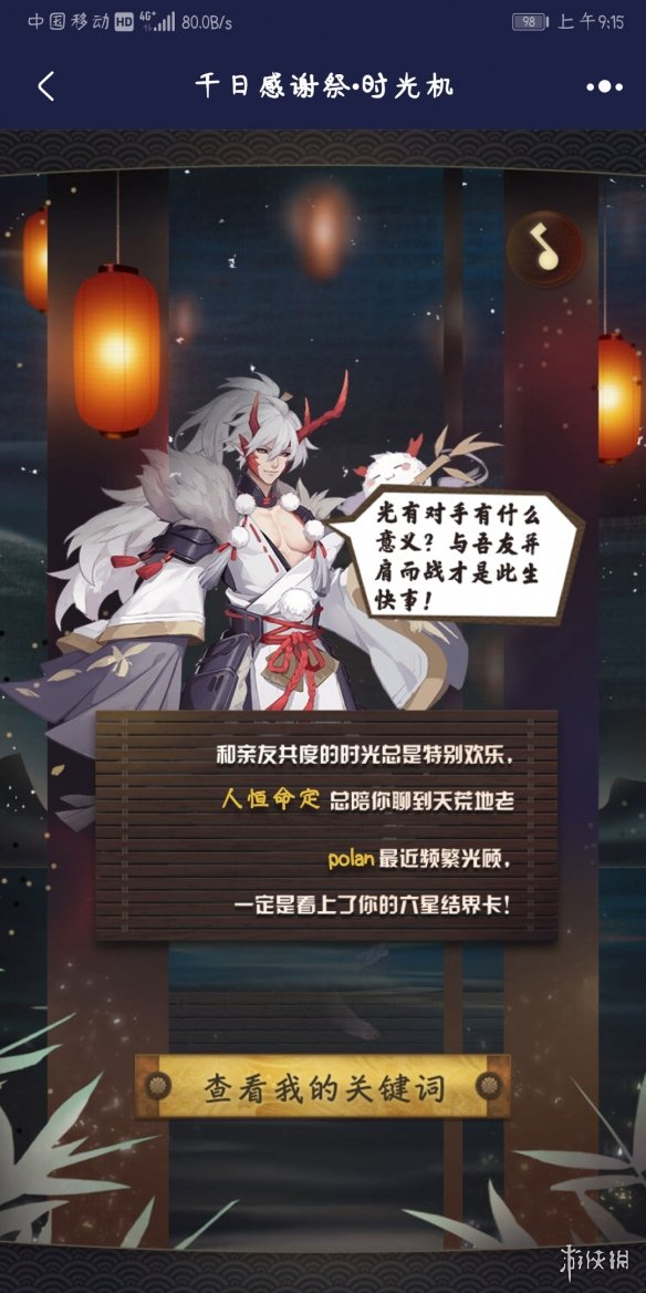 阴阳师千日祭时光机活动今天正式开启了,大神app里千日时光机可以看咯,在本次的时光机中有一些过往的回忆,还有每个人自己的关键词。下面就和小编一起来看看吧!