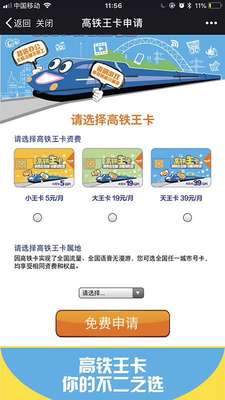 大家可以根据自己的需求,看看自己适合办那一种高铁王卡,最实惠的肯定是39元的天王卡了。选择好高铁王卡之后选择城市,然后直接点击“免费申请”。