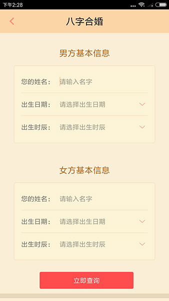 2、直接在首页中输入自己的姓名、性别、出生日期、生辰等信息,即可立即测算