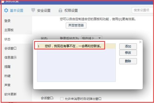3. 启用自动回复:在设置菜单中找到“消息通知”或类似的选项,然后选择“自动回复”或“离线回复”功能,并开启它。