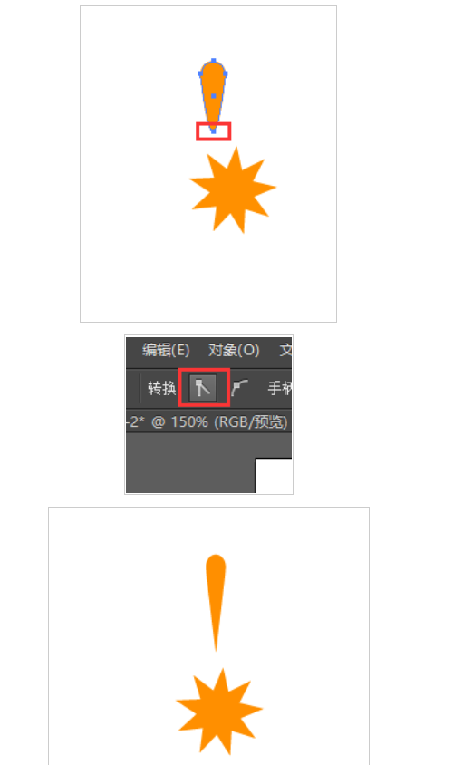 选中圆形底部的锚点,往下拖动,并将锚点转为尖头,调整好的水滴形状与星形居中对齐;
