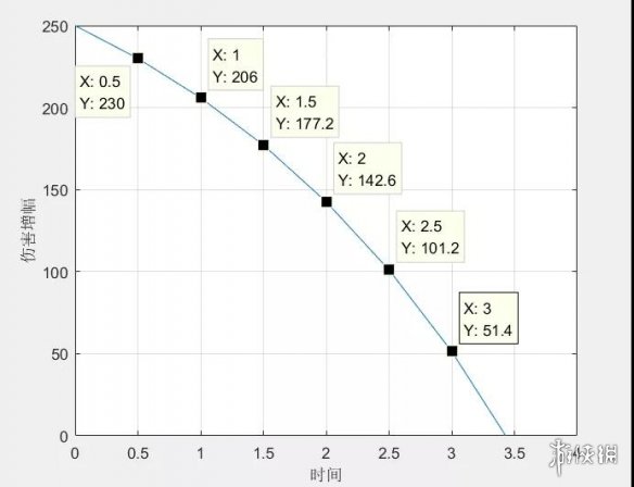 解读:从敌人出现在场上起,玩家会对其有250%的增伤效果以及80%的伤害减免效果,不过随着时间经过,增益BUFF的效果会减弱。比如增伤BUFF,第0.5秒的时候会降低20%变为230%,第1秒的时候会在230%的基础上下降20%(1+20%)=24%,也就是230%-24%=206%。