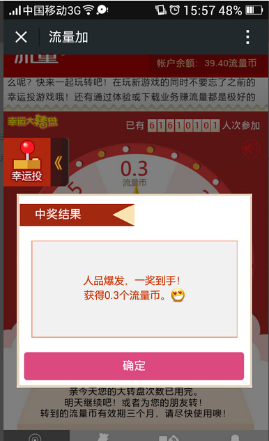 这时候就会出现一个大转盘的抽奖页面,页面下显示着每天都能抽3次奖,最高可以抽中30M流量。