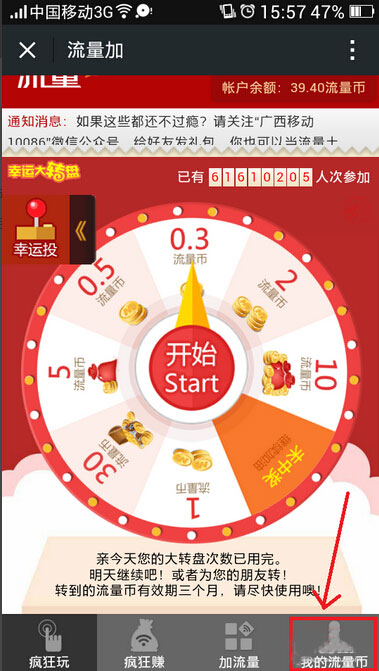 在公众号得页面最底栏,点击“赚流量”的地方,这时候会进入到一个新的抽奖页面。