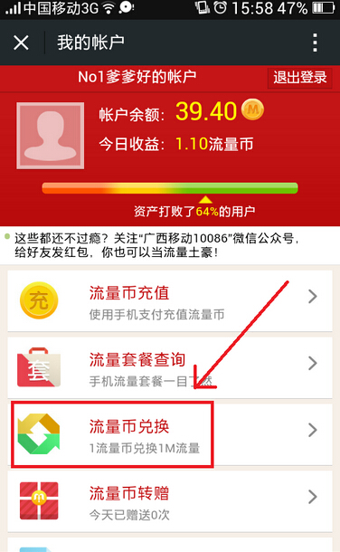 页面显示后会有多个选项,但是你只需要点击“流量币兑换”就可以了,其他的不要去理会。